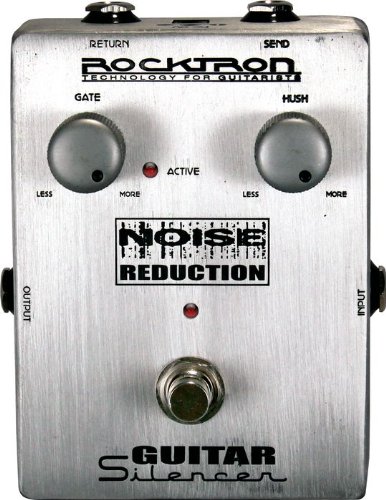 Now you can achieve noise exterminating bliss with Rocktrons incredible new Guitar Silencer stomp box that combines patented HUSH noise reduction technology with a noise gating process. This combination of two means to achieve noise elimination provides one outrageous noise killing device!No matter what style of playing you do, from pop to metalhead madness, the Guitar Silencer is your swiss army knife for wiping out hiss and silencing those changes in your music. The Guitar Silencer allows you to go from heavy all out distortion to SILENCE by muting your guitar strings! All this WITHOUT changing your tone! Thats right, we said your tone will not be changed! There are times when your music calls for single-ended noise reductionthat softer version of noise elimination that allows your sustain to ring out, unaffected, while getting rid of creeping hiss and circuit noise and that is what Rocktrons patented HUSH does so well. Then there are times when you want hard noise gating, to chop the ends of your notes while achieving instant noise kill. (This was first achieved remarkably in metal by Dimebag Darrel of Pantera fame while recording with the original rack mounted Rocktron Guitar Silencer years ago). This new stomp box provides BOTH of these noise reducing methods in one simple pedal that takes a minimum of space on your pedalboard.Part of the Rocktron Boutique Series of stomp boxes, this pedal design comes in a rugged metal chassis with eye popping retro custom design laser etched artwork. This is a TRUE BYPASS pedal: when you turn it offit is out of your signal path!As an incredible bonus, you can add True Bypass to your favorite distortion pedal when adding the Guitar Silencer to your setup!Controls for the Guitar Silencer include GATE, which is the Threshold at which the noise gate portion of the effect will clamp to silence. The HUSH control determines the Threshold of the noise floor you want the HUSH portion of the effect to reduce.The ACTIVE LED lights ...